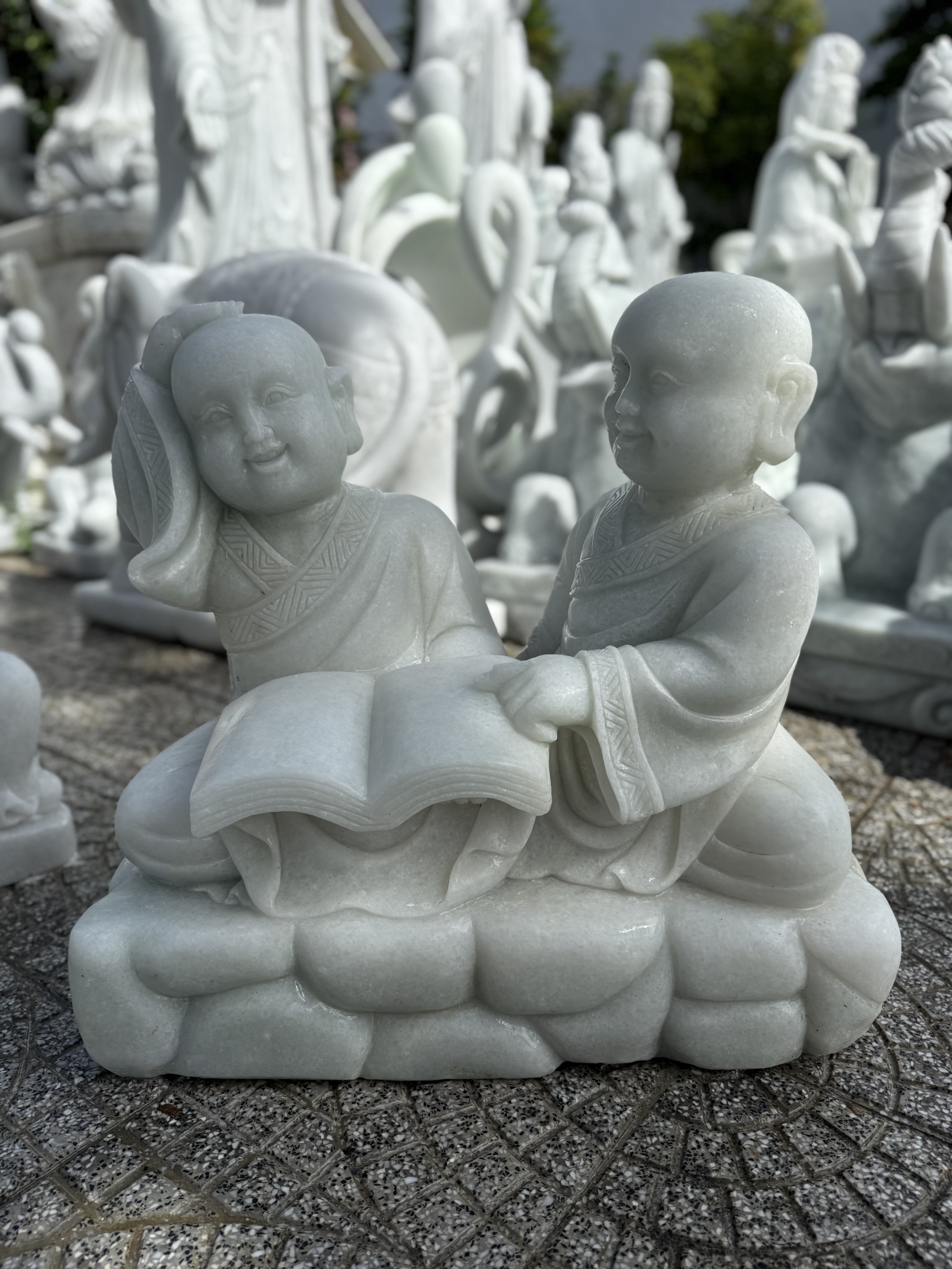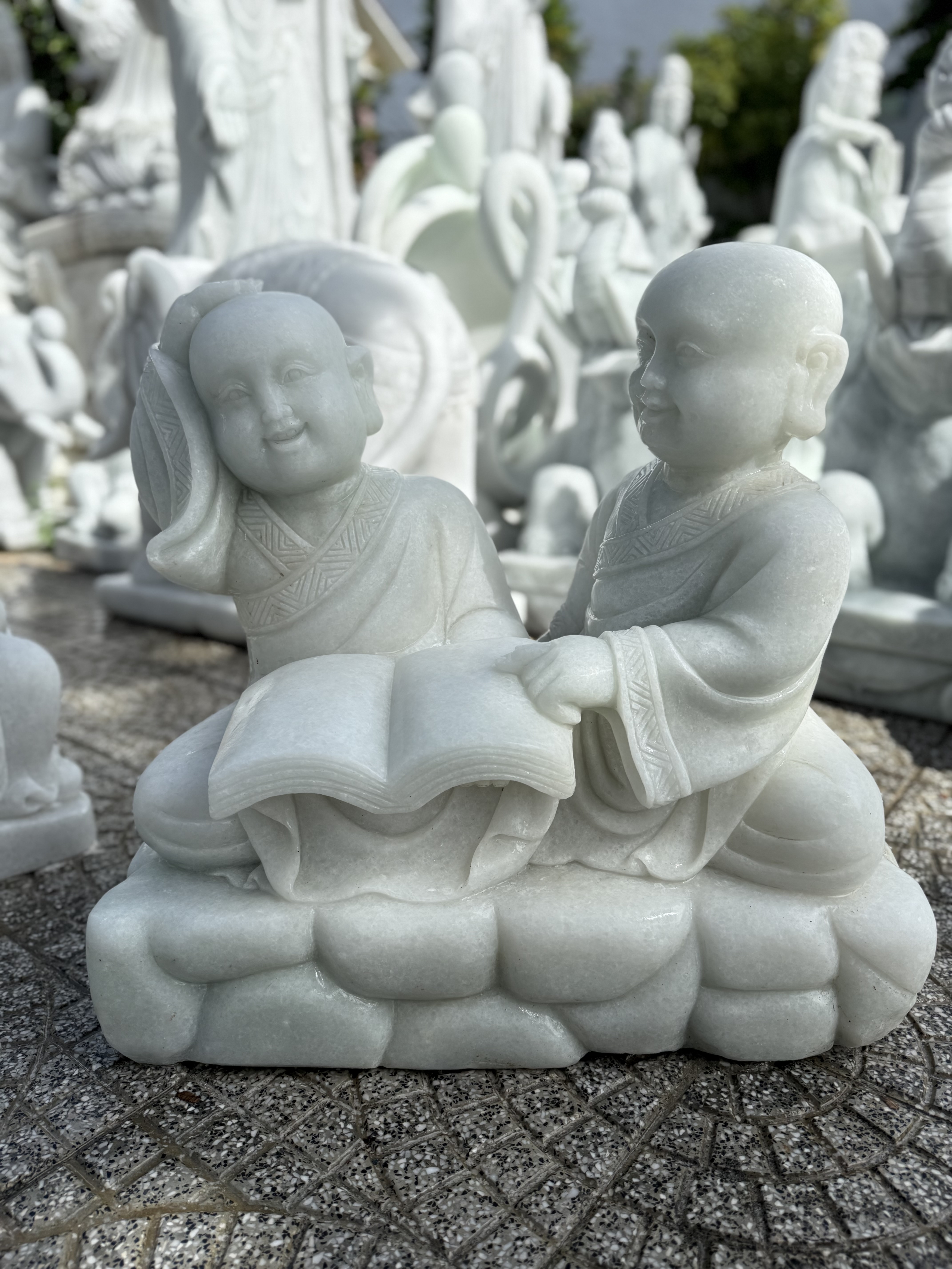 Hai tượng chú tiểu ngồi đọc sách đá nguyên khối.