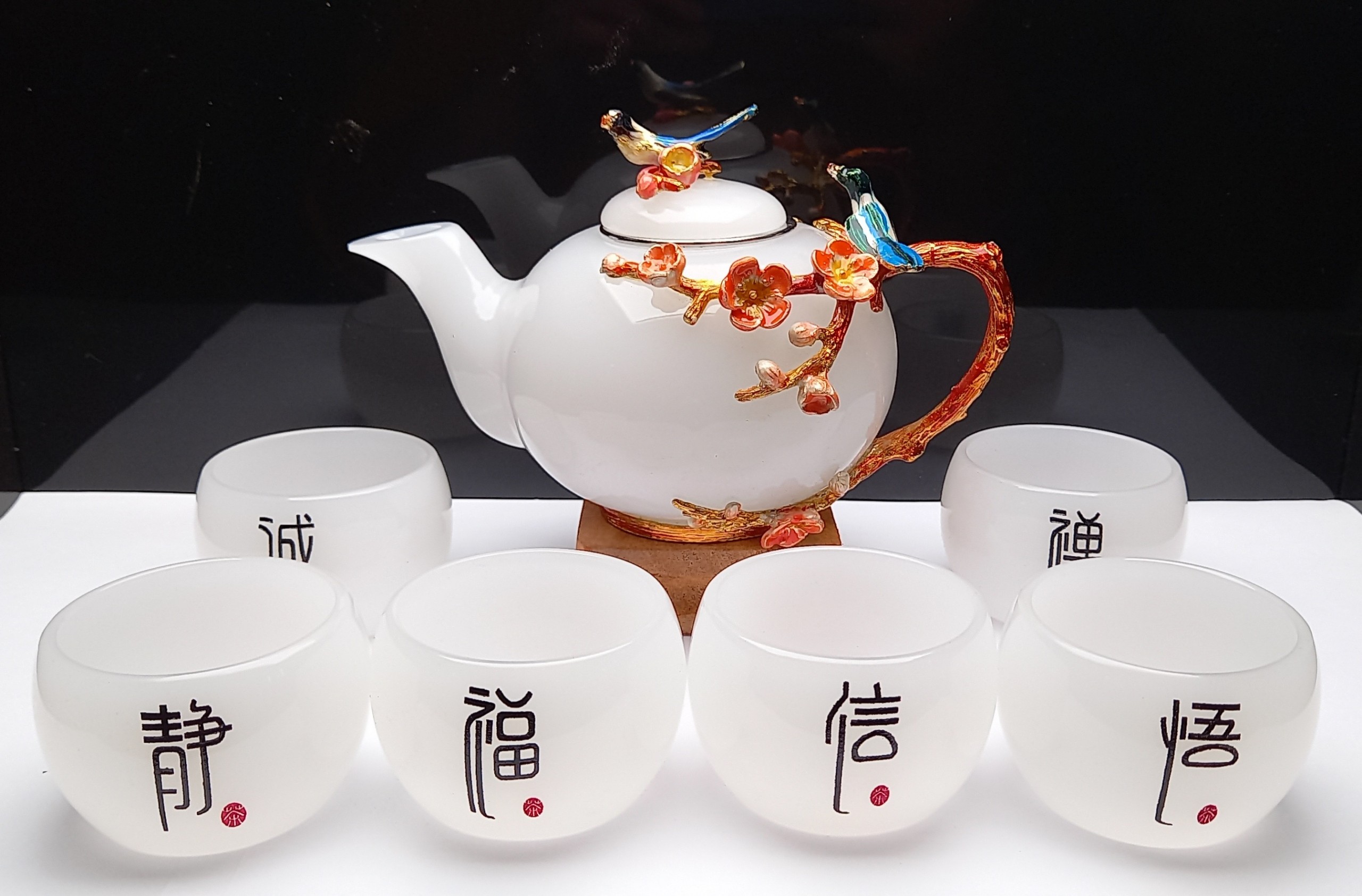 Bộ ấm trà Bạch ngọc hoạ tiết hoa đào và chim 3d.