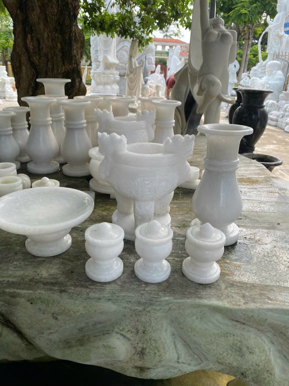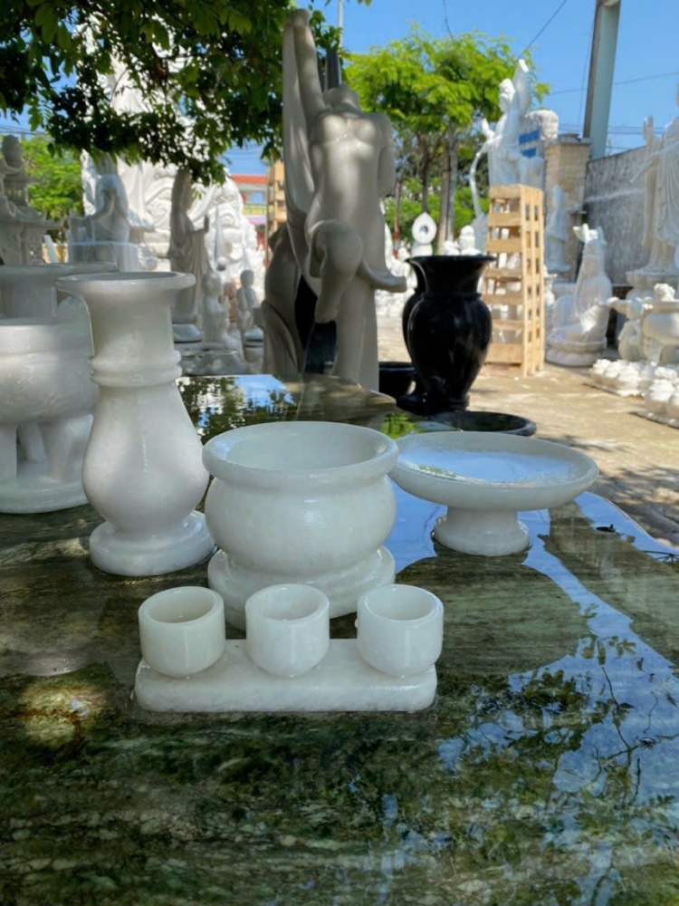 Bộ đồ thờ bằng đá tự nhiên nguyên khối - Lư hương đá - Bình hoa đá - Dĩa bồng đá...