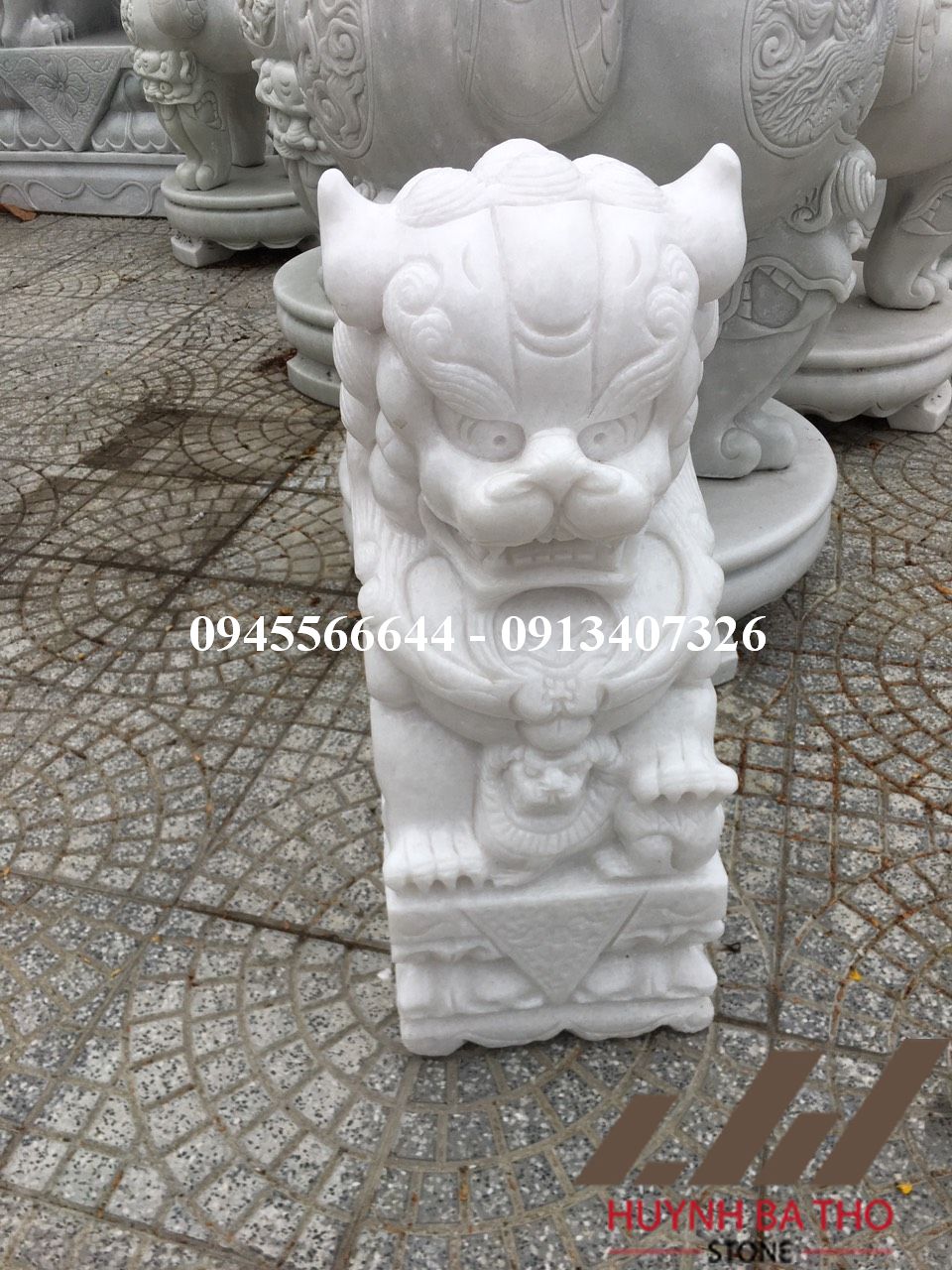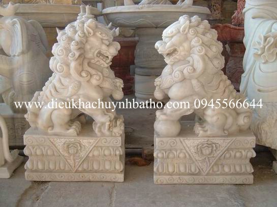 Tượng Kỳ Lân đá trắng non nước nguyên khối cao 70cm tại cơ sở điêu khắc đá mỹ nghệ non nước Huỳnh Bá Thơ. Trong truyền thuyết, Kỳ Lân đá là một loài linh thú thuộc tứ linh “Long, Lân, Quy, Phượng”. Nó mang trong mình một nguồn sức mạnh và sự thần bí linh thiêng. Kỳ Lân đá có phần đầu giống rồng, có hai sừng, thân hình giống hươu, phủ đầy vảy, lông đuôi dài, cuộn sóng. Thoạt nhìn, hình dáng và thần thái của Kỳ lân trông rất sinh động, mạnh mẽ, thần bí và tràn trề sức sống.