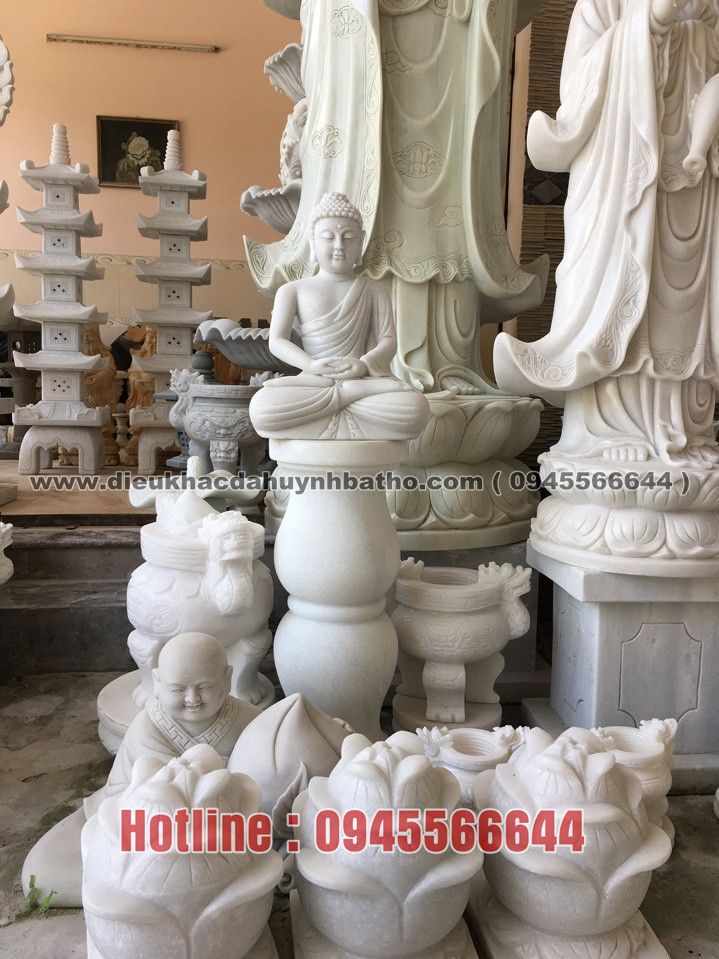 Phật Di Lặc ngồi đài sen cao 105cm đá trắng nguyên khối non nước.