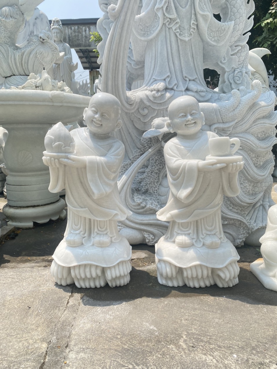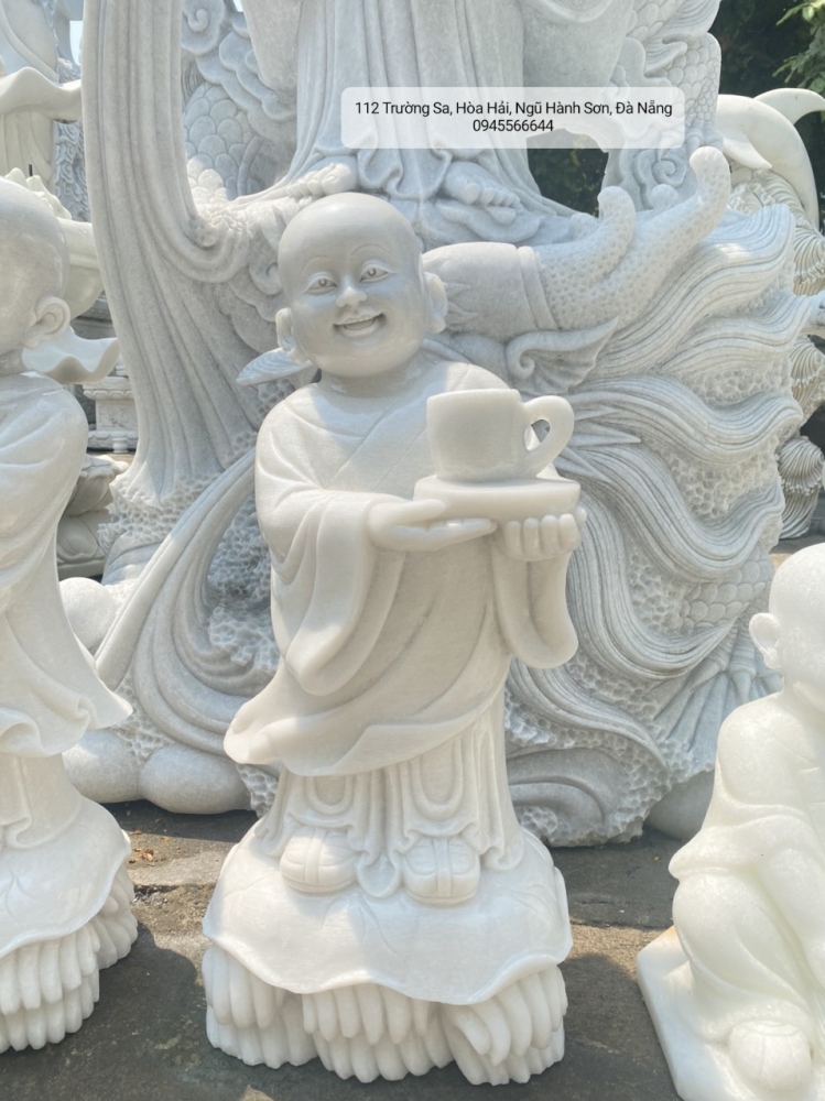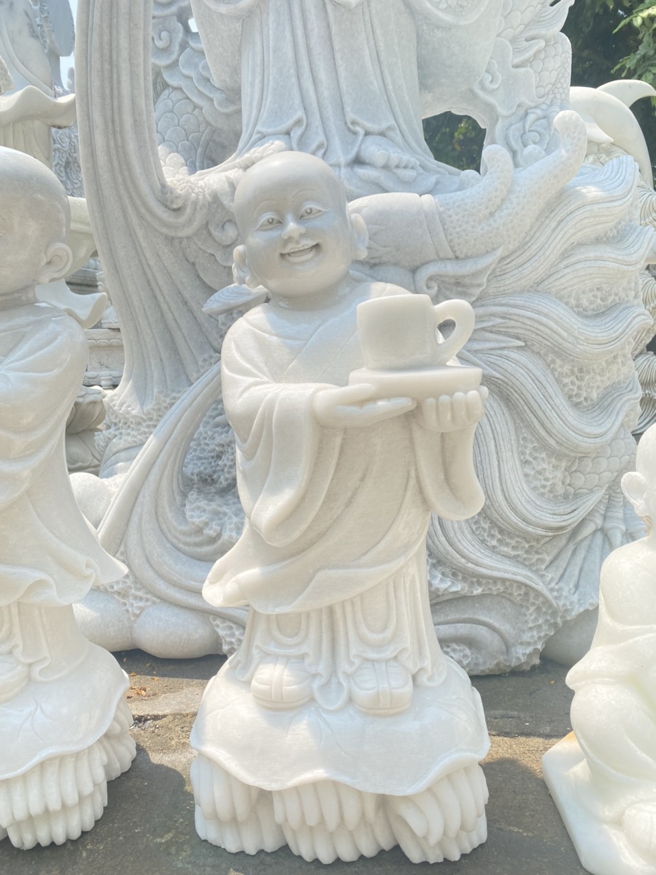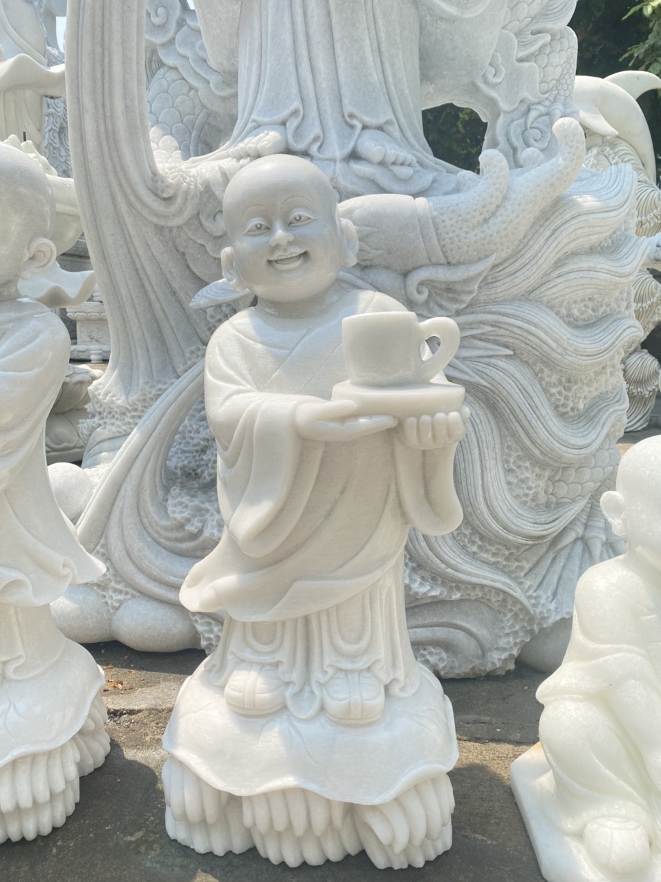 Tượng chú tiểu dâng trà đá trắng nguyên khối đẹp