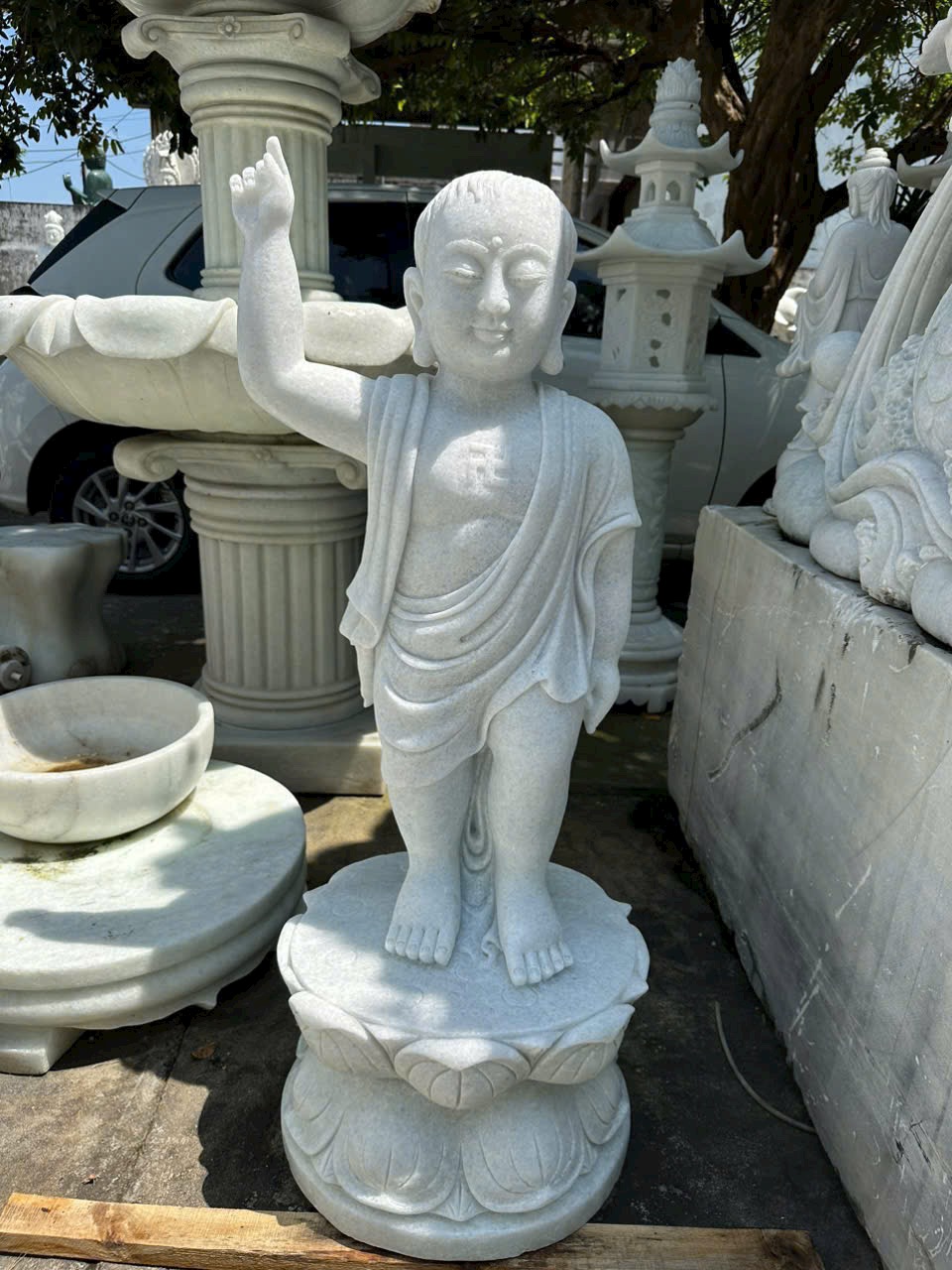 Tượng chú tiểu đá trắng nguyên khối