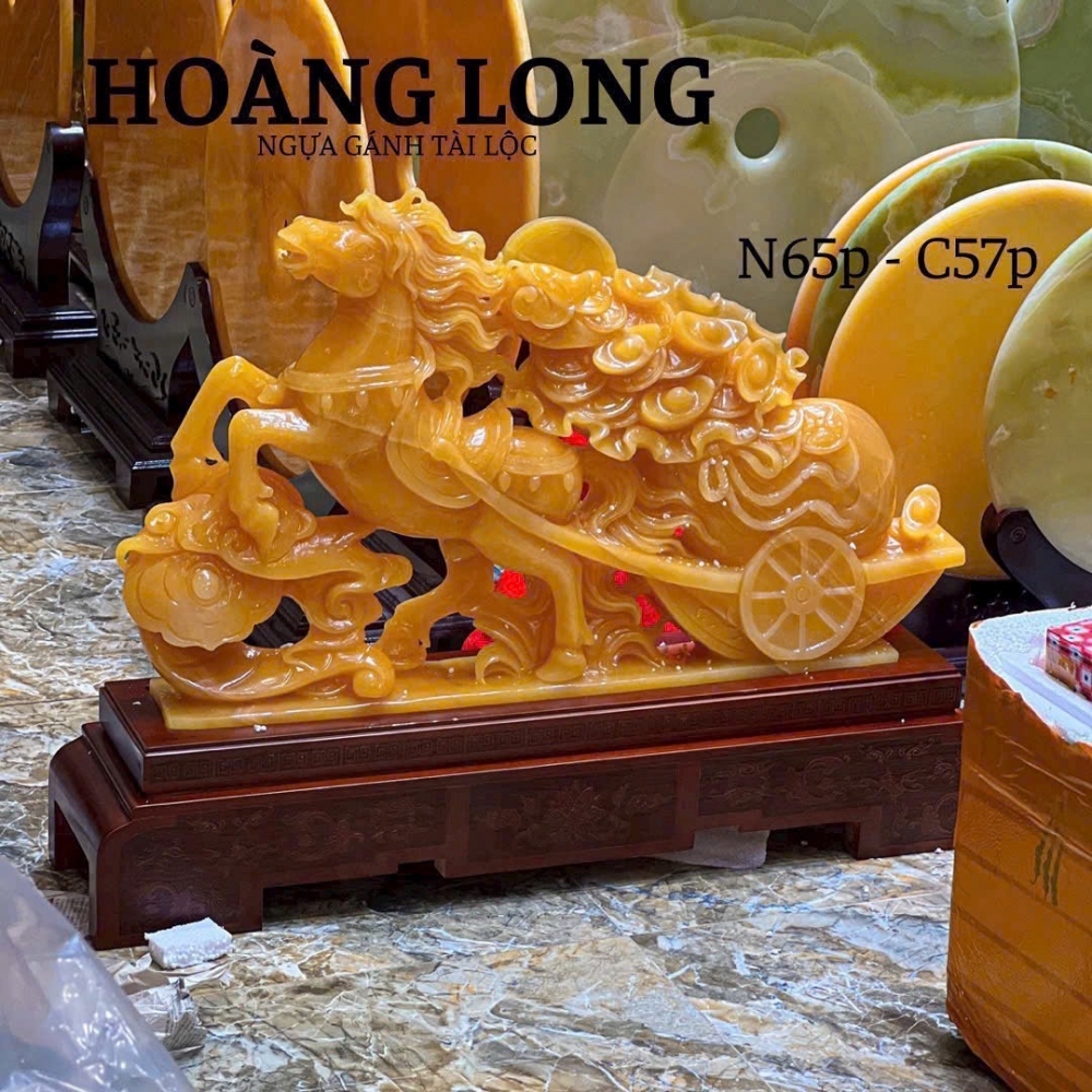 Tượng ngựa đá ngọc kéo thỏi vàng và túi tiền bắp cải 65cm