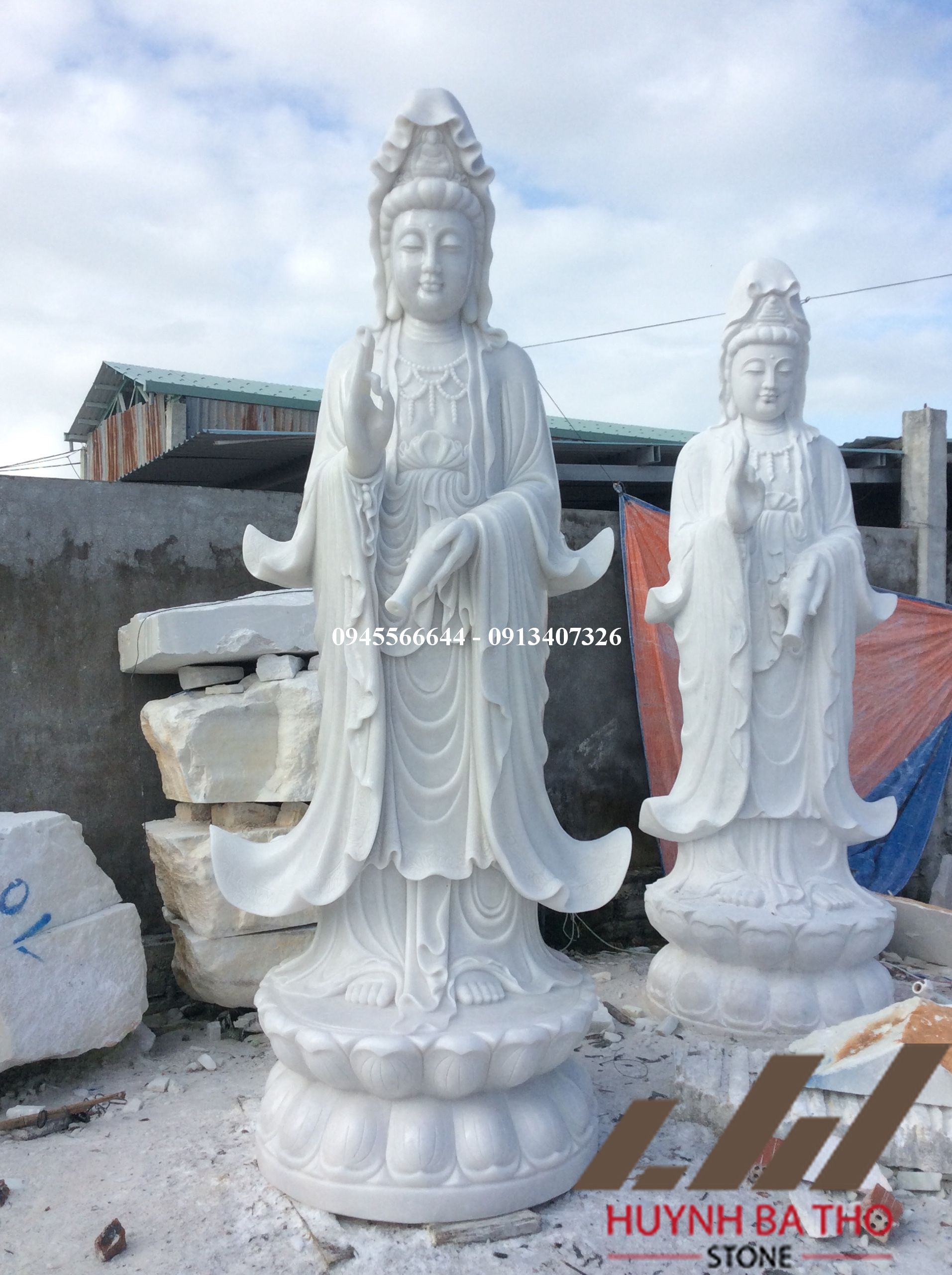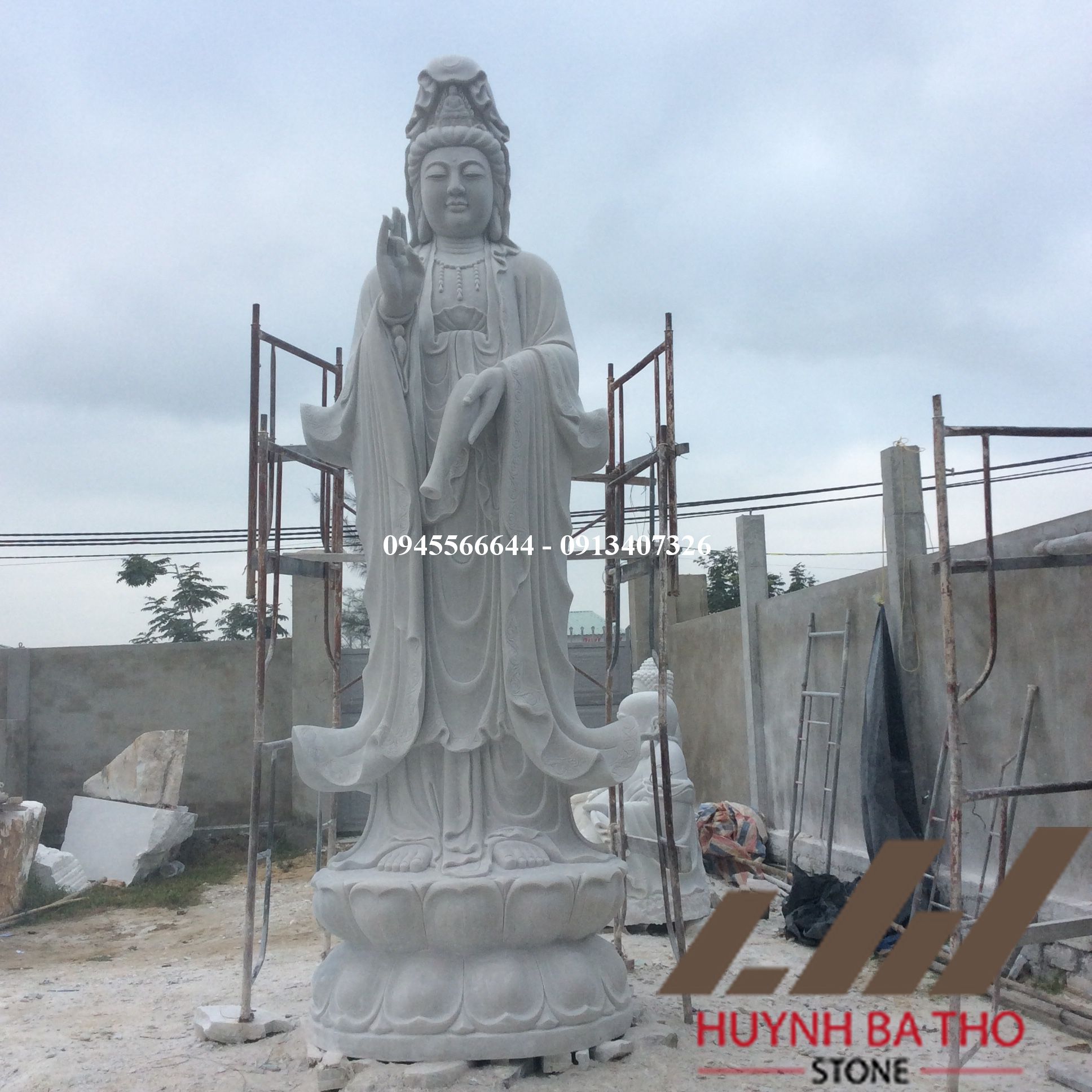 Tượng Phật Quan âm đứng đá trắng xanh cao 2,5m.