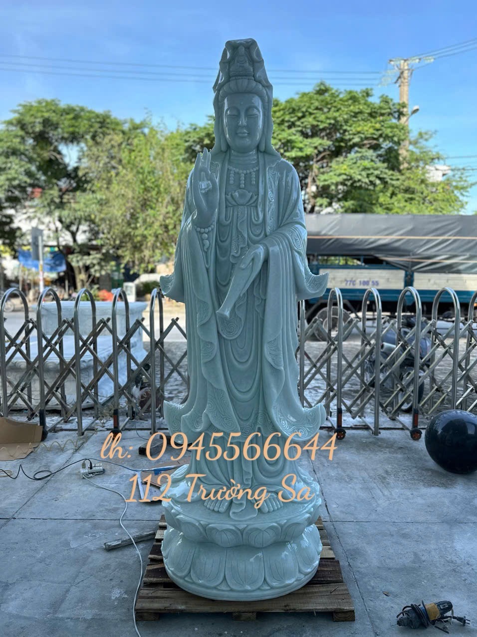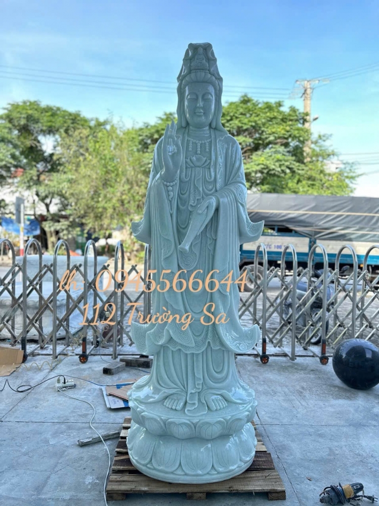 Tượng Phật Quan âm đứng đá trắng xanh cao 2,5m.