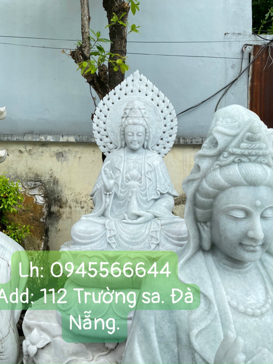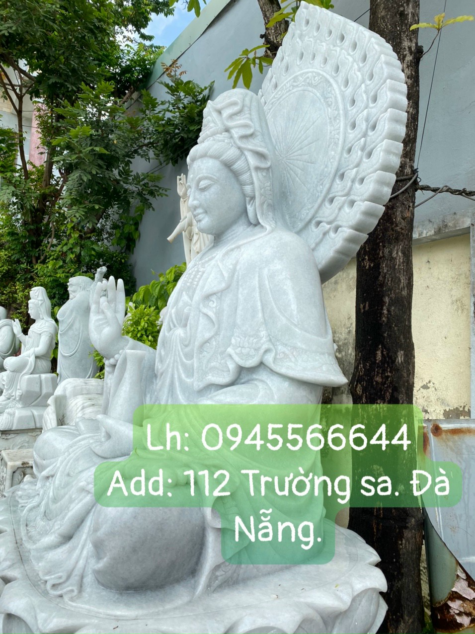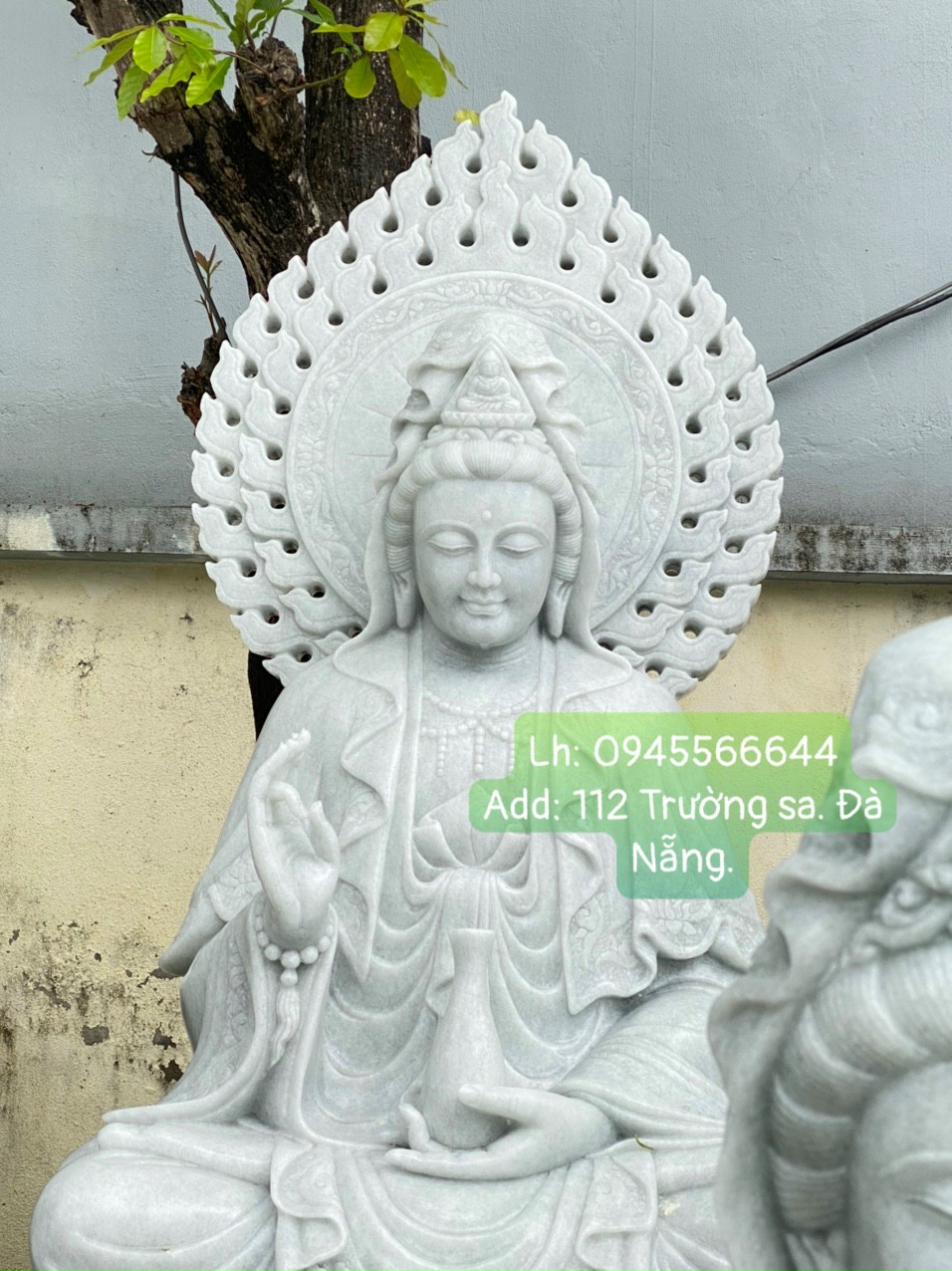 Tượng Phật Quan Âm ngồi đài sen có hào quang đá cẩm thạch trắng nguyên khối.