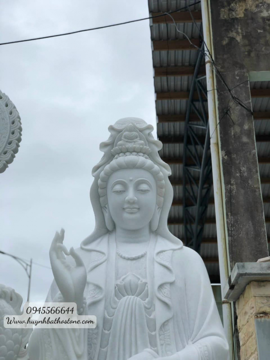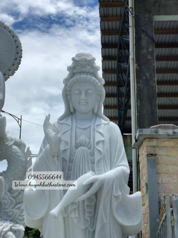 TƯỢNG PHẬT QUAN ÂM ĐỨNG ĐÀI SEN BẰNG ĐÁ CẨM THẠCH TRẮNG NGUYÊN KHỐI.