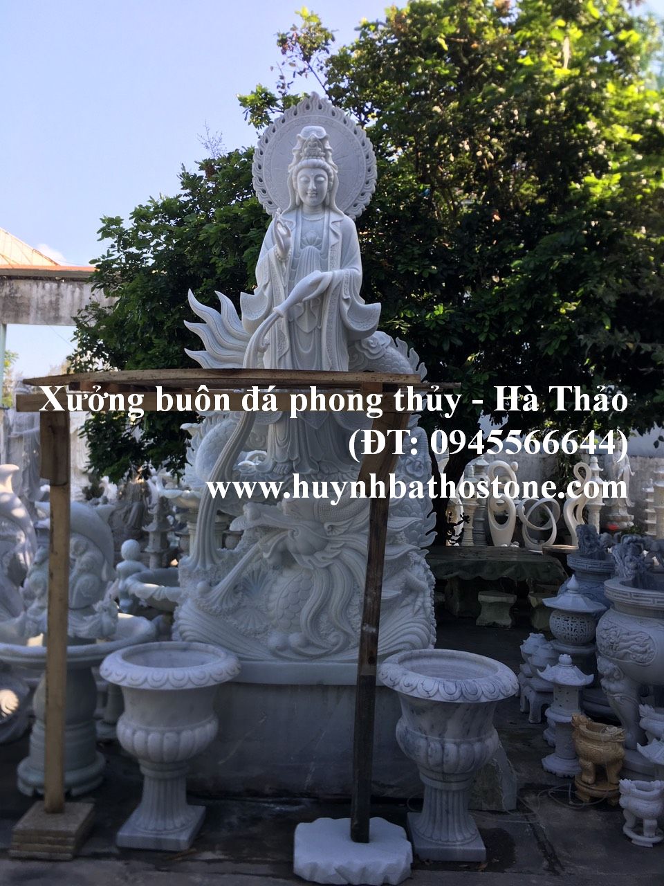 Tôn tượng phật Bồ Tát Quan Âm cưỡi rồng(Quan âm Nam Hải)Theo phong thủy của bức tượng quan âm cưỡi rồng đá mỹ nghệ non nước như sau: Quan âm cưỡi rồng hiển linh là để cứu nhân sinh thoát khỏi cuộc sống đau khổ. Khi thờ cúng tượng phật trong nhà của bạn, mọi xung đột, mâu thuẫn hay gúc mắt hiểu lầm giữa mọi người thân trong gia đình hay xã hội đều nhanh chóng tan biến, nhanh chóng hóa hận thù thành tình thân, yêu thương. Có nhiều tượng Quan Âm đứng hoặc ngồi trên tòa sen, nhưng bức tượng này Quan Âm lại đứng trên hình tượng 1 con rồng dũng mãnh, vô cùng uy nghiêm. Vị Quan âm đứng trên thân mình rồng với dáng khoan thai, 2 tay đở lấy bình ngọc đổ nước Cam lộ xuống trần để dặt tắt lửa lòng chúng sinh trong dương thế. Với chạm khắc tinh tế, thiết kế tinh xảo, bức tượng như là hình tượng sống thật, một tác phẩm nghệ thuật hoàn hảo, rất phù hợp thờ phụng cho nhiều gia đình và các chùa.