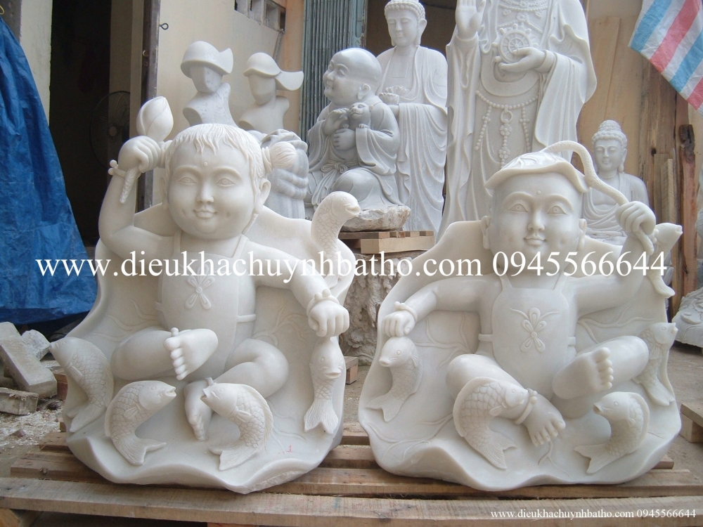 Tượng chú tiểu đá trắng nguyên khối