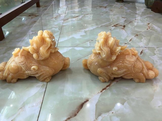 Tỳ hưu đá ngọc hoàng long dài 30cm Tỳ hưu đá ngọc hoàng long tự nhiên 30 cm là vật phẩm phong thủy thu hút tài lộc, hóa sát trừ tà, hộ mệnh bình an cho gia chủ. Tỳ hưu thường được trưng thành 1 cặp trong nhà tại các vị trí như cửa ra vào, bàn thờ thần tài, bàn làm việc… nhằm ngụ ý tịch tà và chiêu tài. Tỳ Hưu là linh vật phong thủy cầu tài lộc, may mắn xuất hiện từ thời vua Minh Thái Tổ (Chu Nguyên Chương) dựng nước. Trải qua hàng ngàn năm Tỳ Hưu luôn được giới quý tộc và doanh nhân ưa chuộng nhằm mục đích cầu phú quý, bảo hộ gia trạch. Tỳ hưu đá ngọc hoàng long tự nhiên được chế tác từ đá tự nhiên mang nguồn năng lượng tương thích với năng lượng cơ thể con người. Đá tự nhiên được hình thành hàng vạn năm trong lòng đất hấp thu năng lượng, linh khí của đất trời nên mang trong mình cát khí và có khả năng thu hút các nguồn năng lượng tích cực như: Tài Lộc, Tịnh Tâm, Sức Khỏe… Tỳ Hưu có đặc điểm không có lỗ hậu môn và chỉ ăn vàng bạc, nên khi trưng Tỳ Hưu trong nhà sẽ giúp gia chủ thu hút tài lộc, kinh doanh thuận lợi, công việc thăng tiến và giữ tiền của tránh việc “tiền vào 5 thất thoát 4”. Ngoài ra, Tỳ Hưu là linh vật nhận được sự ưu ái của trời đất nên mang trong mình linh khí rất mạnh. Chính vì thế ngoài thu hút tài lộc còn có công dụng trấn sát, trừ tà, hóa giải ngũ hoàng đại sát hoặc hóa đất dữ thành lành bảo hộ cho gia chủ. Lưu ý: - Đặt Tỳ Hưu ở vị trí sạch sẽ và trang trọng như: quầy thu ngân, phòng khách, ban thờ thần tài, két sắt… - Hướng đặt Tỳ Hưu luôn luôn phải quay đầu ra hướng cửa chính của ngôi nhà, văn phòng. - Không đặt Tỳ Hưu đối diện gương vì sẽ làm tăng lệ khí cho Tỳ Hưu. - Không đeo dây chuyền Tỳ Hưu khi quan hệ phòng the. - Không tặng Tỳ Hưu đang sử dụng cho người khác vì sẽ chuyển may mắn, tài lộc cho chủ nhân mới của Tỳ Hưu.