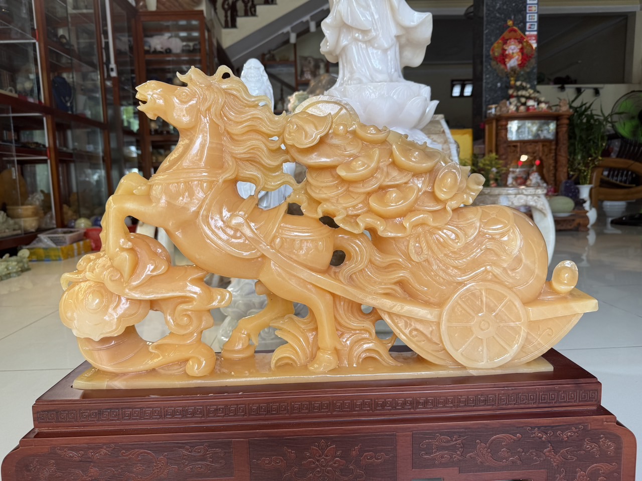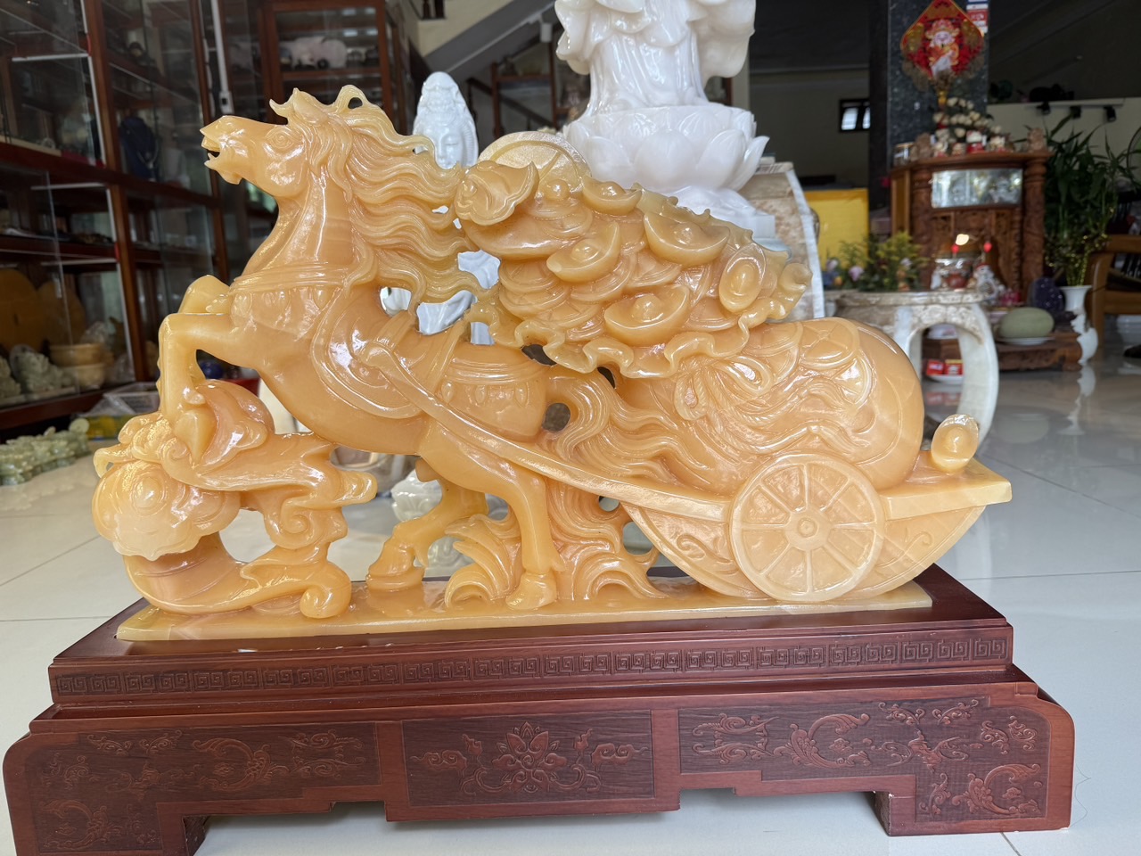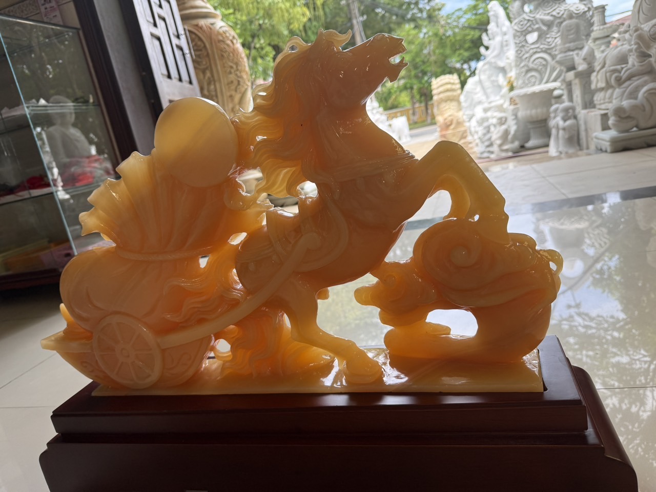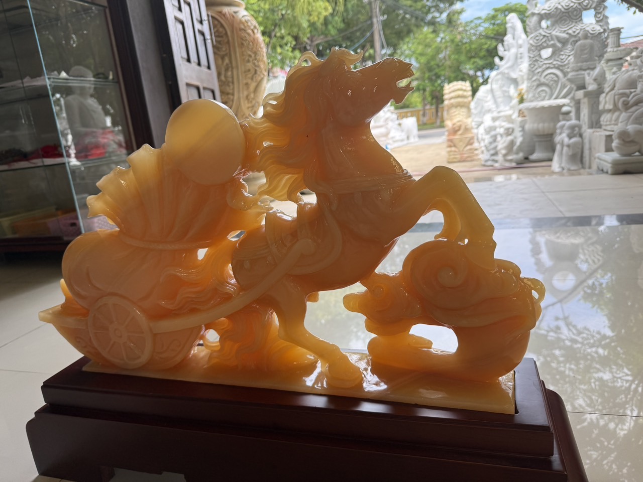 Tượng ngựa đá ngọc kéo thỏi vàng và túi tiền bắp cải 65cm